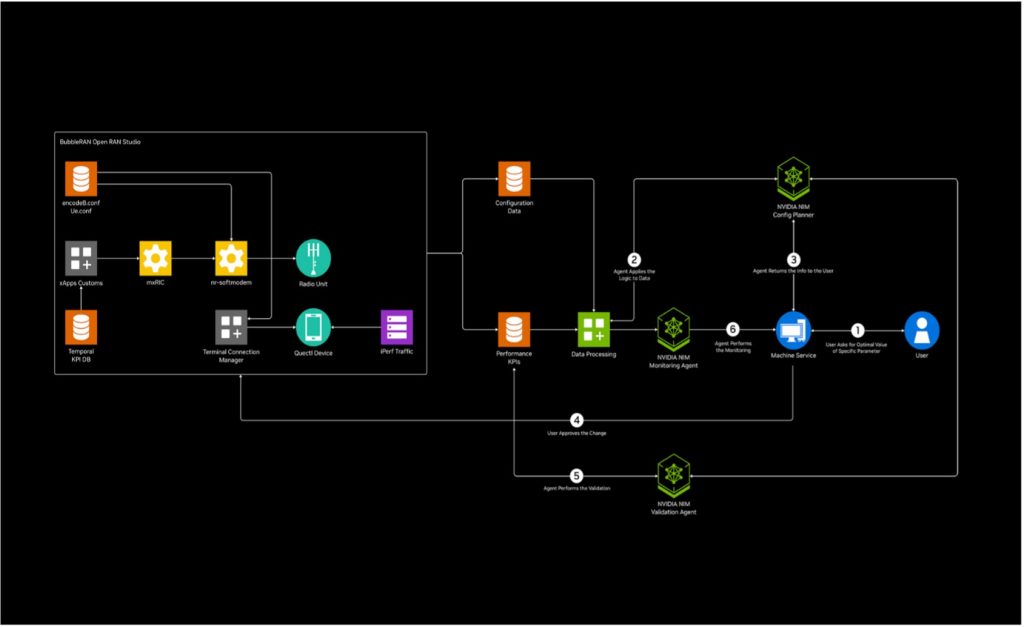 NVIDIA AI Blueprint for telco network configuration, is a foundational building block for AI-driven RAN optimisation using GPU acceleration and closed-loop control. Built with NIM microservices, the blueprint implements an agentic-AI workflow that uses historical KPI data to recommend optimal configurations for specific RAN parameters, validate the user’s selected settings, and monitor KPIs after changes.